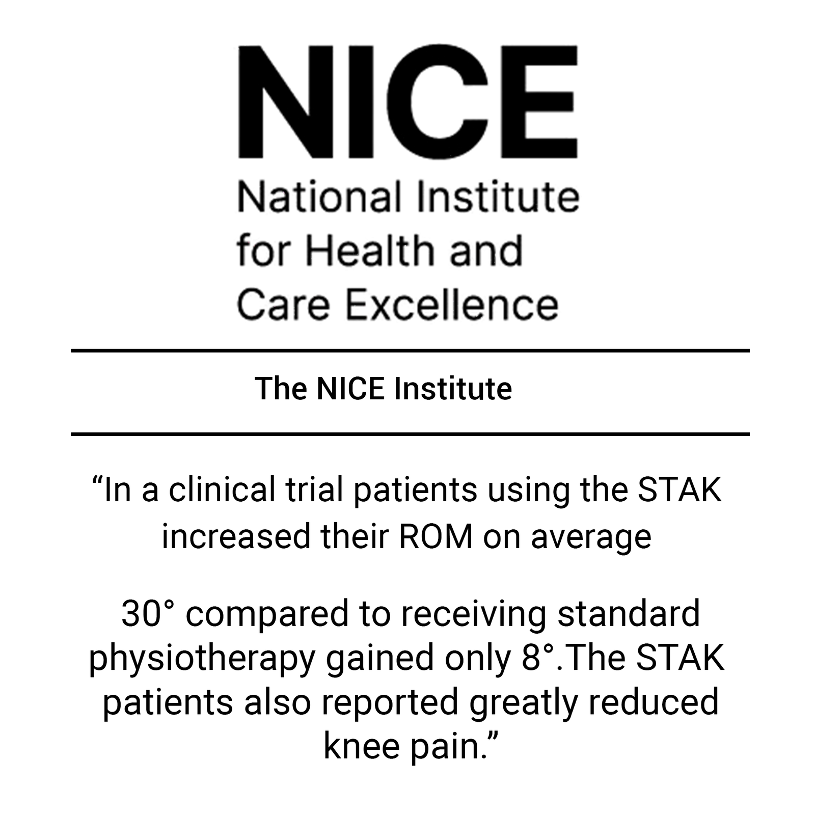 30° compared to receiving standard physiotherapy gained only 8°. The STAK patients also reported greatly reduced knee pain.”